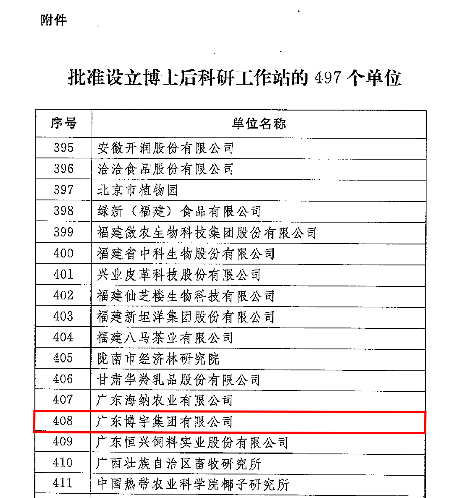 2020年11月27日,根據人力資源和社會保障部、全國博士后管理委員會《關于批準中國科學技術大學先進技術研究院等497個單位設立博士后科研工作站的通知》(人社部函〔2020〕108號),廣東博宇集團有限公司獲批設立博士后科研工作站。